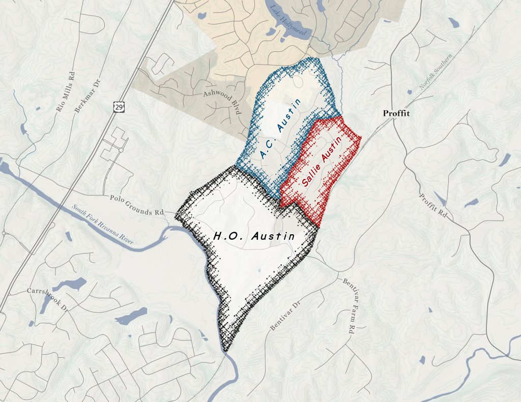 When the Austins moved to the Hollymead area their daughter Sallie was around ten years old. Their son H.O., present in the 1860 census, likely died sometime before 1870 because he does not appear in later records. A third child, Alexander Campbell, also called A.C. or Campbell, was born around 1869 and grew up on Retreat.  It is likely the family also brought their eleven slaves with them as well.