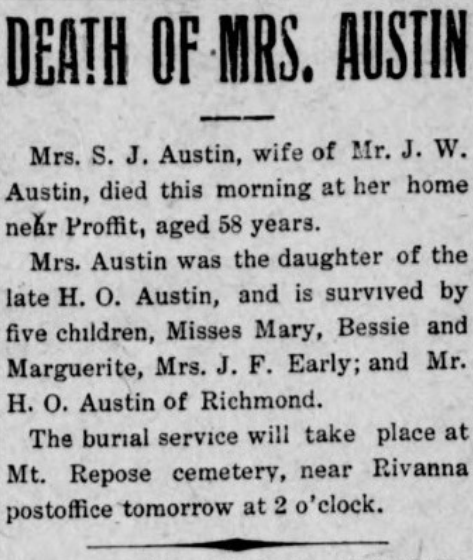 “The community was greatly shocked this morning by the news of the death of Mrs. Margaret Austin…wife of Dr. H.O. Austin, which occurred last night at twelve o’clock. Her death was so sudden that her children, Mrs. James Austin and Mr. Campbell Austin, did not reach her bedside in time to say goodbye. The internment will take place at Mt. Repose, Sunday at 11 a.m. Much sympathy is expressed for the bereaved husband, who is in very feeble health.”